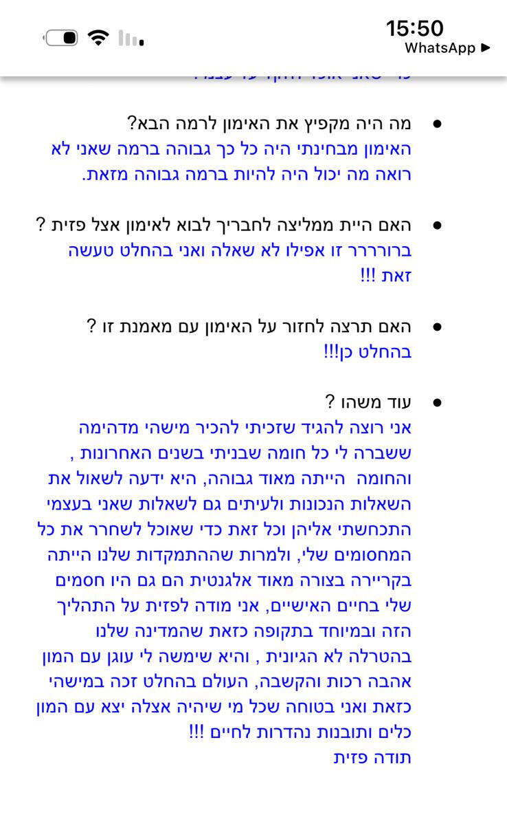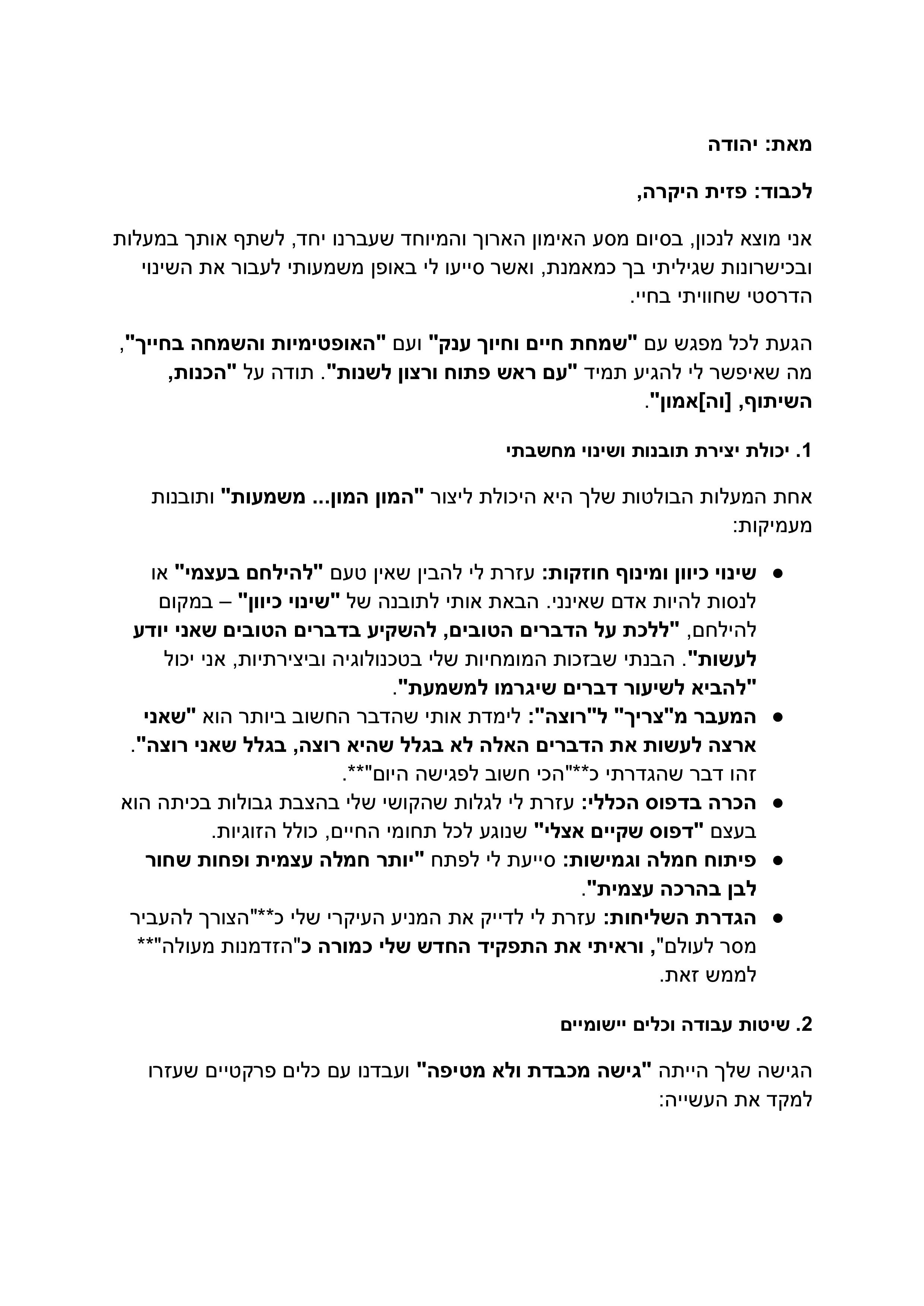 פזית היקרה, אחרי שהתאוששתי קצת מאתמול, רציתי להגיד לך תודה ענקית! על ההקשבה, ההבנה, האכפתיות, ההכוונה והמילים החמות. הייתה לי שיחה ממש משמעותית איתך שנכנסה לי לגמרי ללב ושינתה ממש את החשיבה והראייה שלי לטובה.